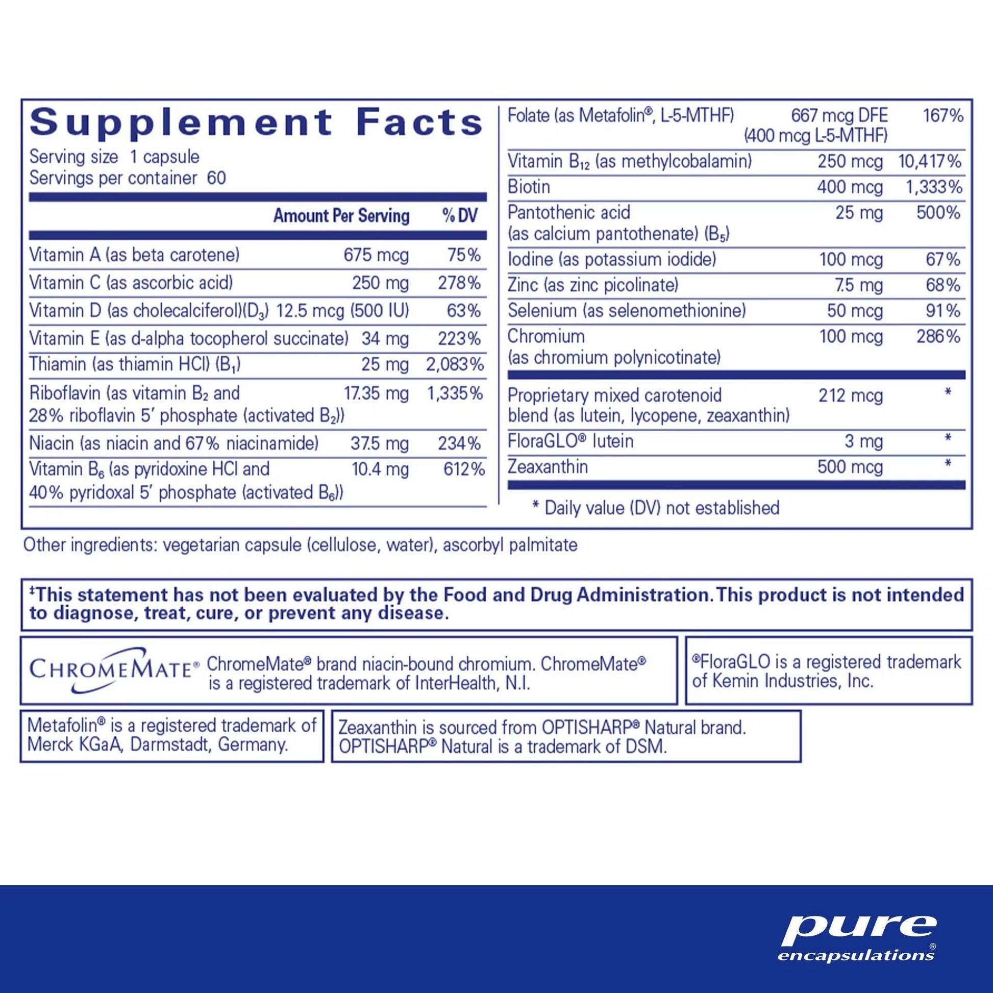 INDICATIONS: Ages 18 and up Provides a concentrated core of nutrient essentials supporting various physiological functions and daily wellness SUGGESTED USE: As a dietary supplement, take 1 capsule, 2 times daily, with meals. WARNING:If you are pregnant or lactating, have any health condition or are taking any medication, consult your health professional before use. SOURCE: Ascorbic acid: corn dextrose fermentation Ascorbyl palmitate: corn dextrose fermentation and palm oil Vitamin D3: cholesterol from wool fat (lanolin) Vitamin E: soy Vitamin B1 (thiamin HCl): synthetic Vitamin B2 (riboflavin): fermentation of corn Niacinamide and Niacin: synthetic Vitamin B6 (pyridoxal HCl): synthetic Folate (Metafolin, L-5-MTHF): synthetic Vitamin B12 (methylcobalamin): fermentation of corn Biotin: synthetic Vitamin B5 (calcium pantothenate): synthetic Minerals: naturally derived from lime of rock Beta carotene: Blakeslea trispora Lycopene: natural tomato concentrate Lutein: marigold flower extract Zeaxanthin: synthetic Mixed carotenoid profile typically contains 4,500 mcg beta carotene, 125 mcg lycopene, 250 mcg lutein and 50 mcg zeaxanthin STORAGE:Store in a cool, dry place.