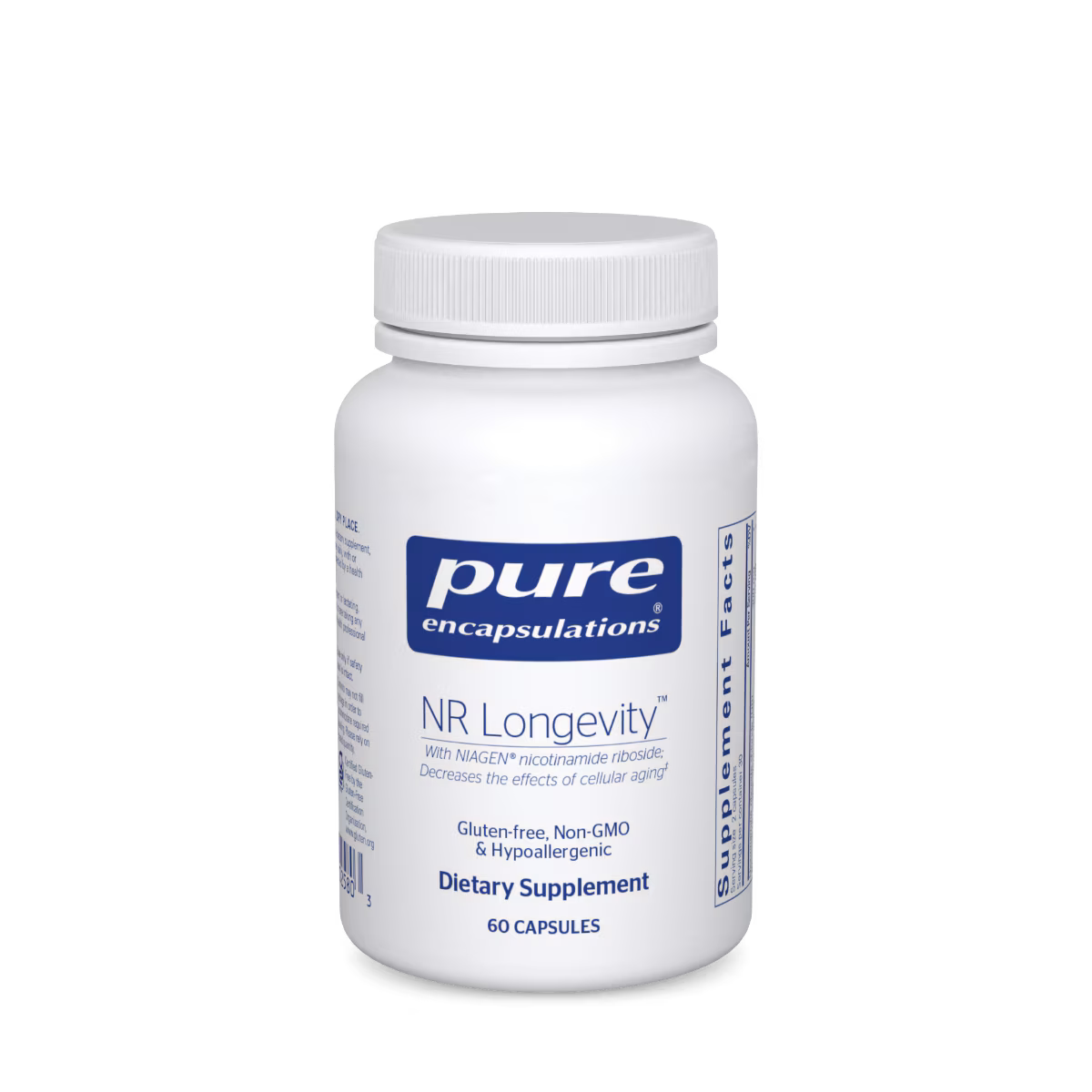 NR Longevity is specially designed to target biological processes that decline with age, such as the body’s natural ability to make energy, build new mitochondria and protect cells from oxidative stress. Nicotinamide riboside (NR), resveratrol and sulforaphane promote healthy aging by replenishing NAD+, enhancing mitochondrial function and providing antioxidant support, respectively. Nicotinamide riboside (NR) is a form of vitamin B3 that acts as a precursor of nicotinamide adenine dinucleotide (NAD+), which plays a critical role in cellular energy production.NAD+ activates enzymes in the sirtuin family, considered to be master switches of metabolism and regulators of aging. Notably, NAD+ activates SIRT1, an epigenetic switch that regulates metabolism and supports mitochondrial biogenesis, cellular energy production and cellular longevity. Higher NAD+ levels are associated with healthy mitochondrial function. Conversely, cellular NAD+ levels decline with age, and can decrease by up to 50% over the adult lifespan. Supplementing with NR enhances NAD+ levels, supporting the function of NAD+ dependent enzymes that maintain cellular energy production and repair. NR has been clinically shown to increase NAD+ levels in as little as 2 weeks.2 Resveratrol and sulforaphane promote longevity in model organisms. Both compounds enhance cellular antioxidant defenses, helping to protect cells against oxidative stress that increases with age and contributes to age-related cellular decline. Resveratrol activates the AMPK/SIRT1/PGC-1alpha axis, a pathway that enhances mitochondrial function and supports normal cellular repair while sulforaphane activates Nrf2, a genomic switch that stimulates expression of genes involved in antioxidant defense, cellular protection and mitochondrial biogenesis. Nrf2 is a transcription factor that supports robust, long-lasting expression of numerous genes responsible for phase II detoxification and protection against oxidative stress. Among these genes are glutathione peroxidase, superoxide dismutase and various phase II enzymes, such as glutathione sulfotransferases. Nrf2 also supports expression of glutathione glutamylcysteinyl ligase, which is responsible for a critical step in the biosynthesis of glutathione, a vital component of cellular antioxidant and detoxification systems.