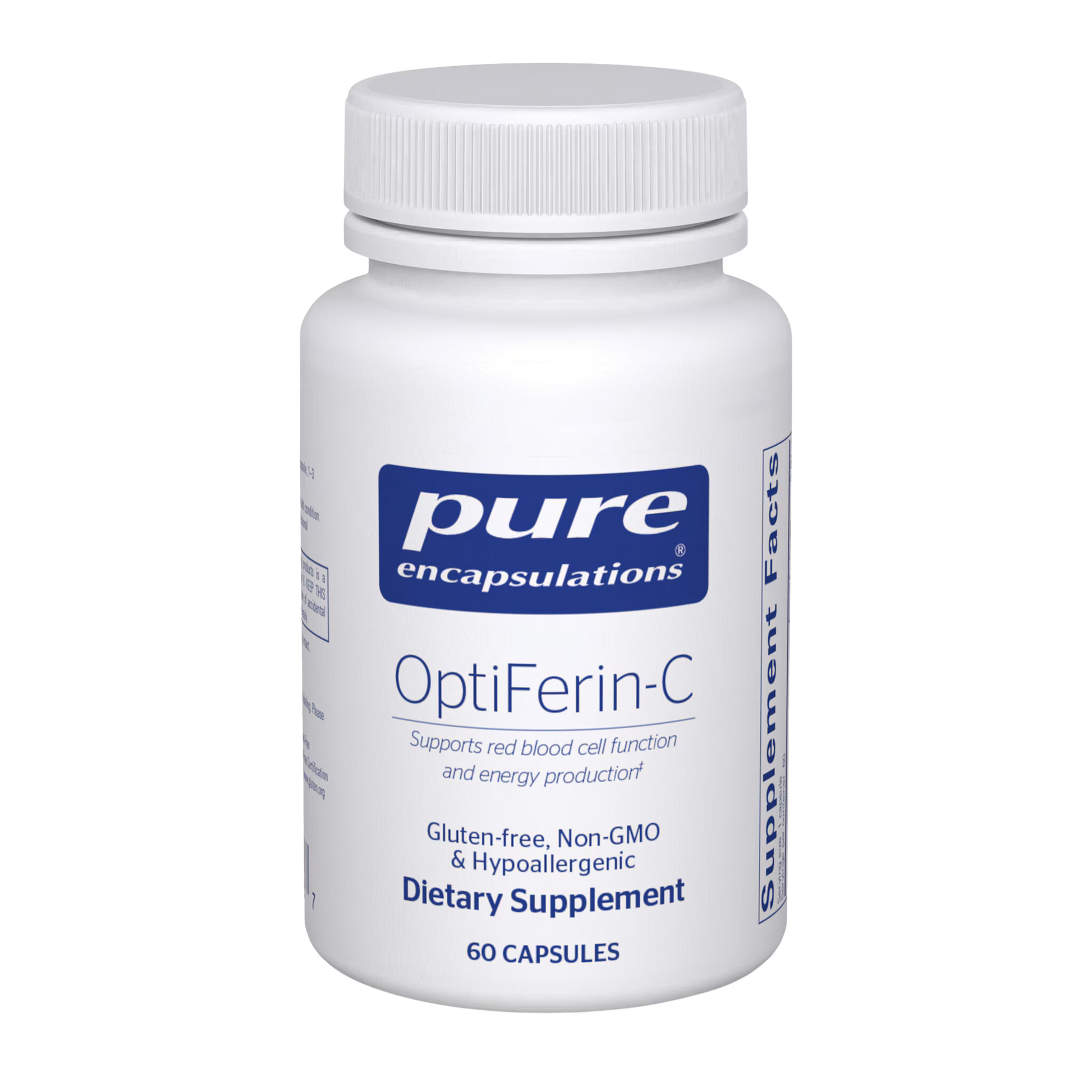 OptiFerin-C is an iron-based supplement formulated to support red blood cells in order to help effectively transport oxygen in the body. Ferrochel brand iron bis-glycinate was developed using unique patented chemistry, allowing it to be absorbed rapidly from the lumen of the intestine into mucosal cells and then released for transport throughout the body. The intestinal mucosal tissue tightly controls the release of Ferrochel , supporting the safety profile of this iron amino acid chelate. In a double-blind, randomized, placebo-controlled trial, iron supplementation supported healthy ferritin levels,energy and well-being in female subjects. Research emphasizes the importance of maintaining healthy serum ferritin for optimal performance, particularlyin elite female athletes. This formula includes buffered vitamin C (as calcium ascorbate) to help enhance the absorption of iron.