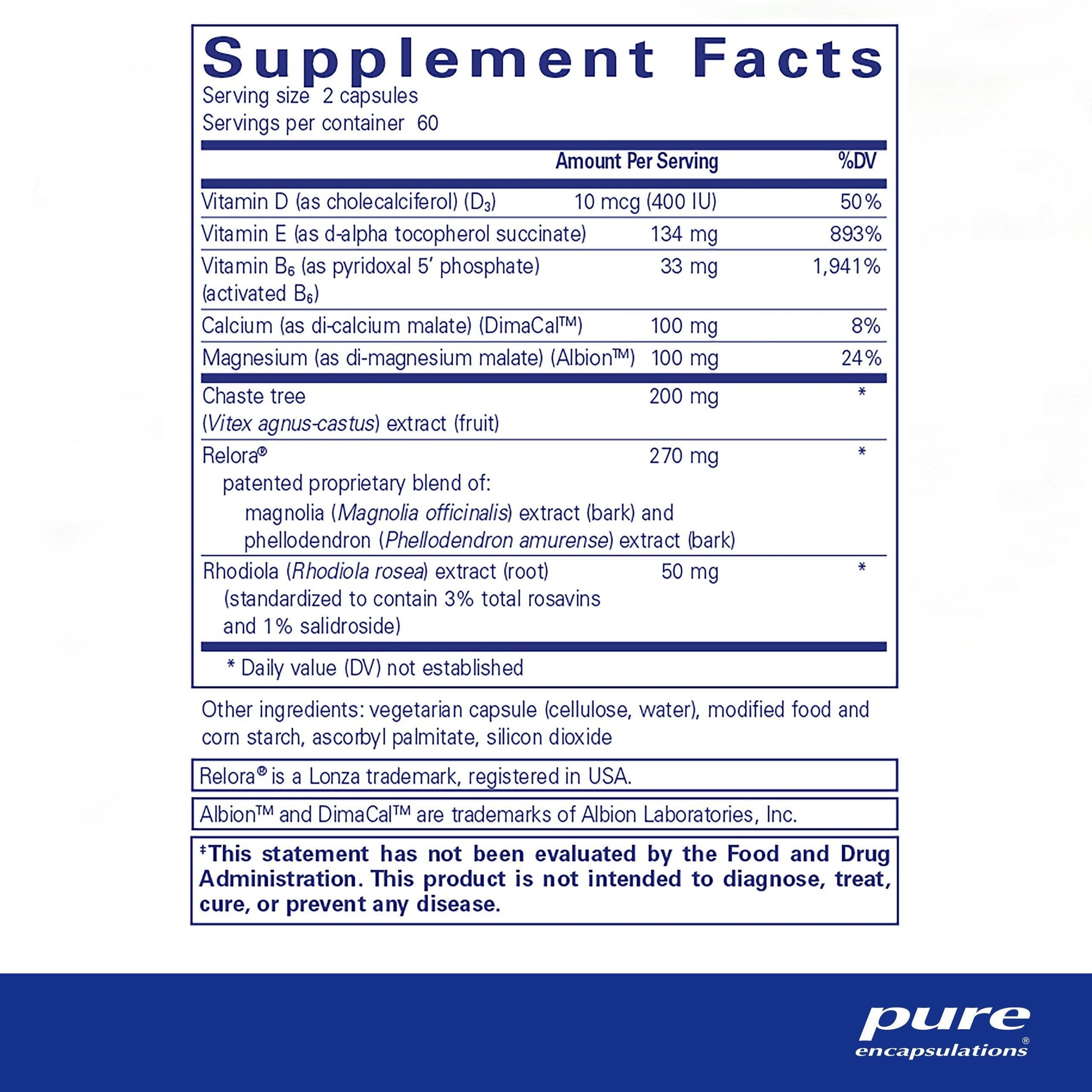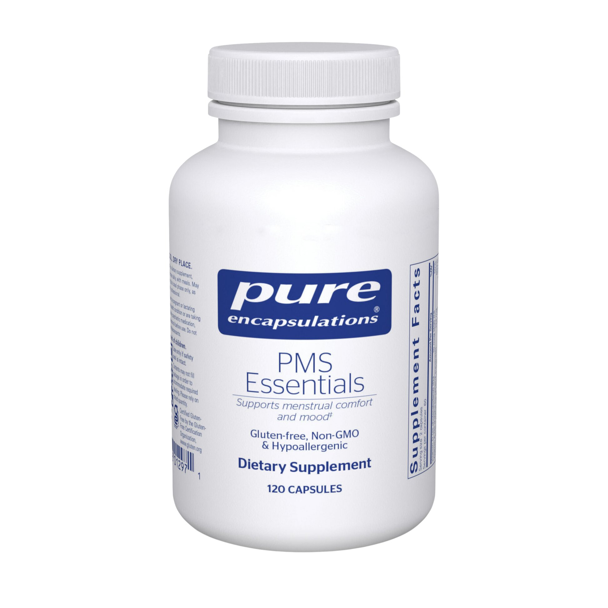 PMS Essentials provides a comprehensive nutrient and botanical approach to support mood, cravings, cramps and bloating associated with the menstrual cycle. Calcium plays a role in healthy smooth muscle function and menstrual comfort. Vitamin D has similar effects, attributed to its ability to promote healthy calcium levels, cyclic hormone function and neurotransmitter activity. Healthy intracellular magnesium levels have been associated with maintaining positive mood during the luteal phase. Magnesium also plays an important role in nervous system sensitivity, providing support for muscle comfort, breast comfort and emotional well-being associated with the menstrual cycle. Studies indicate the positive effect of vitamin B6 on premenstrual mood as well as its crucial role in enhancing the effect of magnesium. Vitamin E research suggests that it helps lessen breast tenderness as well as nervous tension and fatigue associated with the menstrual cycle. Traditionally used and clinically studied, chaste tree provides significant beneficial support for the hypothalamus and pituitary via its balancing effects. Relora may help diminish stress-related sugary snack cravings and support emotional wellness while rhodiola supports energy and mental function.