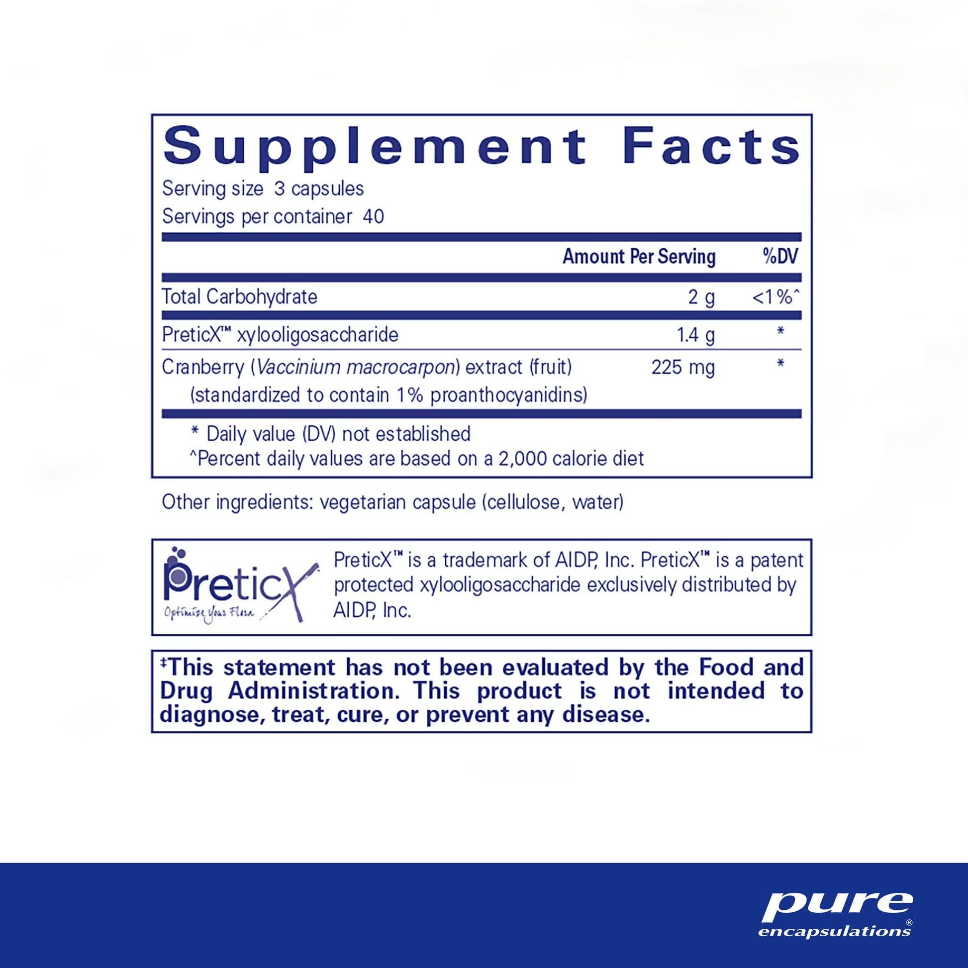 - Enhances Bifidobacterium and healthy gut microflora with a blend of XOS prebiotic and cranberry extract
