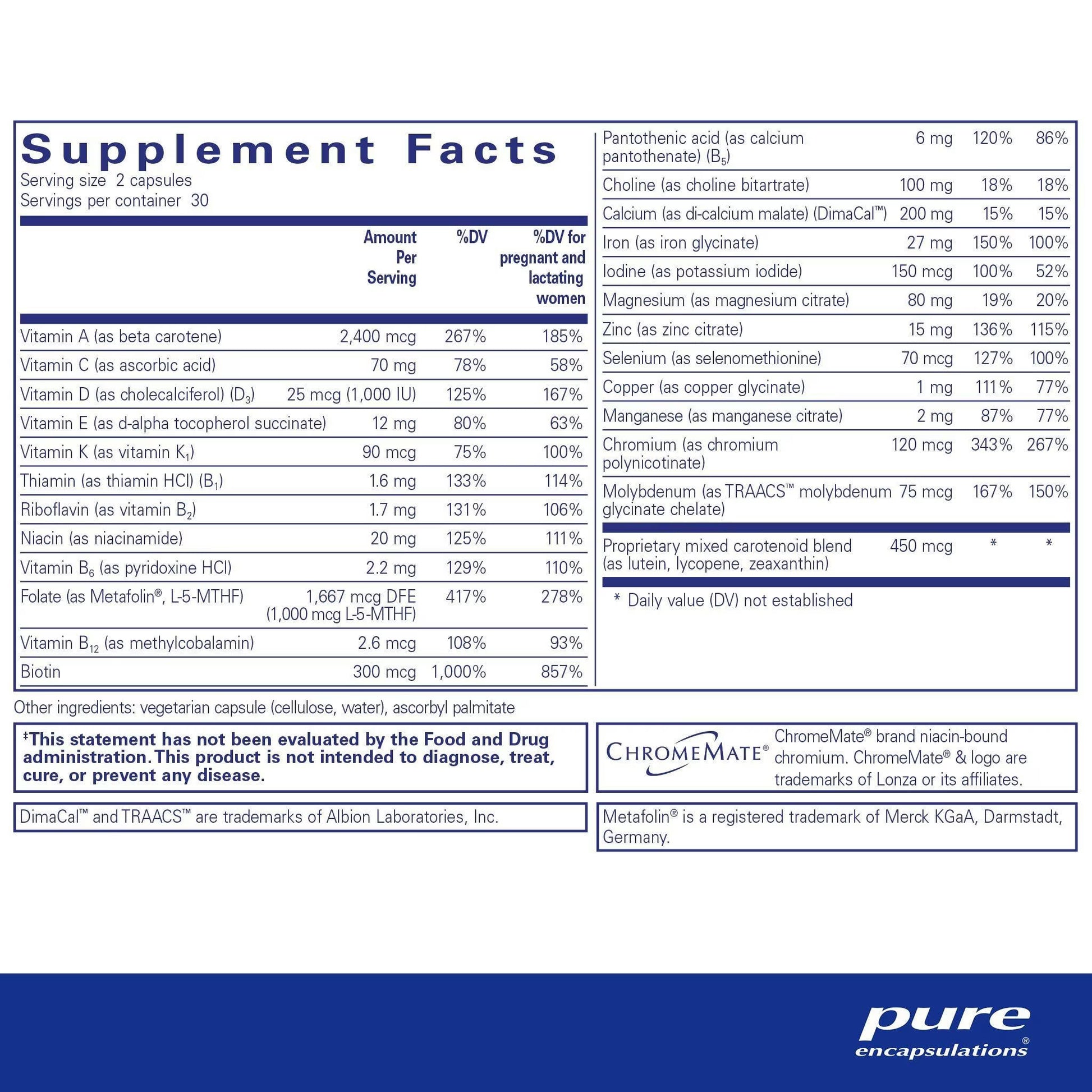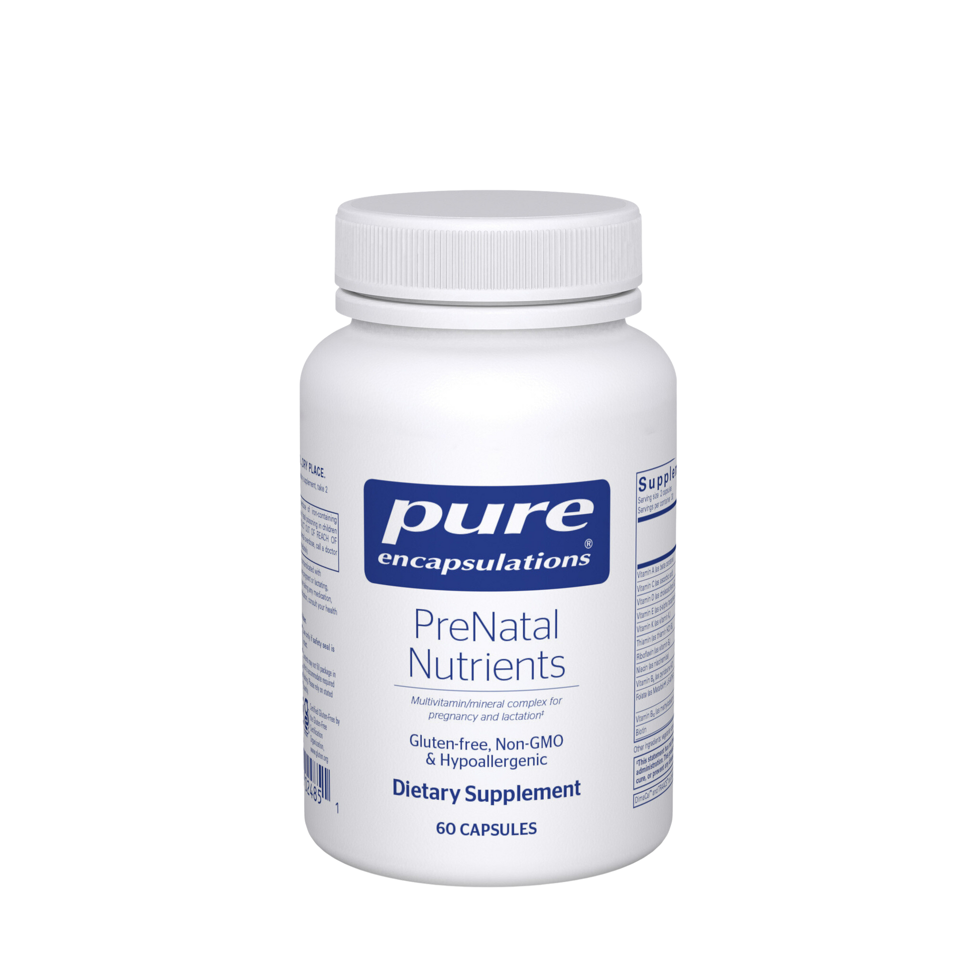 PreNatal Nutrients provides the vitamins and minerals needed to help support maternal and fetal health. Best when combined with EPA/DHA, this formula provides 1 mg of folate as Metafolin L-5-methyltetrahydrofolate (L-5-MTHF), a naturally occurring, universally metabolized form of folate, for optimal neural and cellular development. Vitamin D is offered as algae-derived vegan source. Vitamin K supports healthy carboxylation of proteins for blood-clotting and bone health. Choline (100 mg) contributes to neurotransmitter production, DNA synthesis, protein and energy metabolism, and fetal central nervous system development. Iron (27 mg) and iodine (150 mcg) meet the increased requirements during pregnancy.