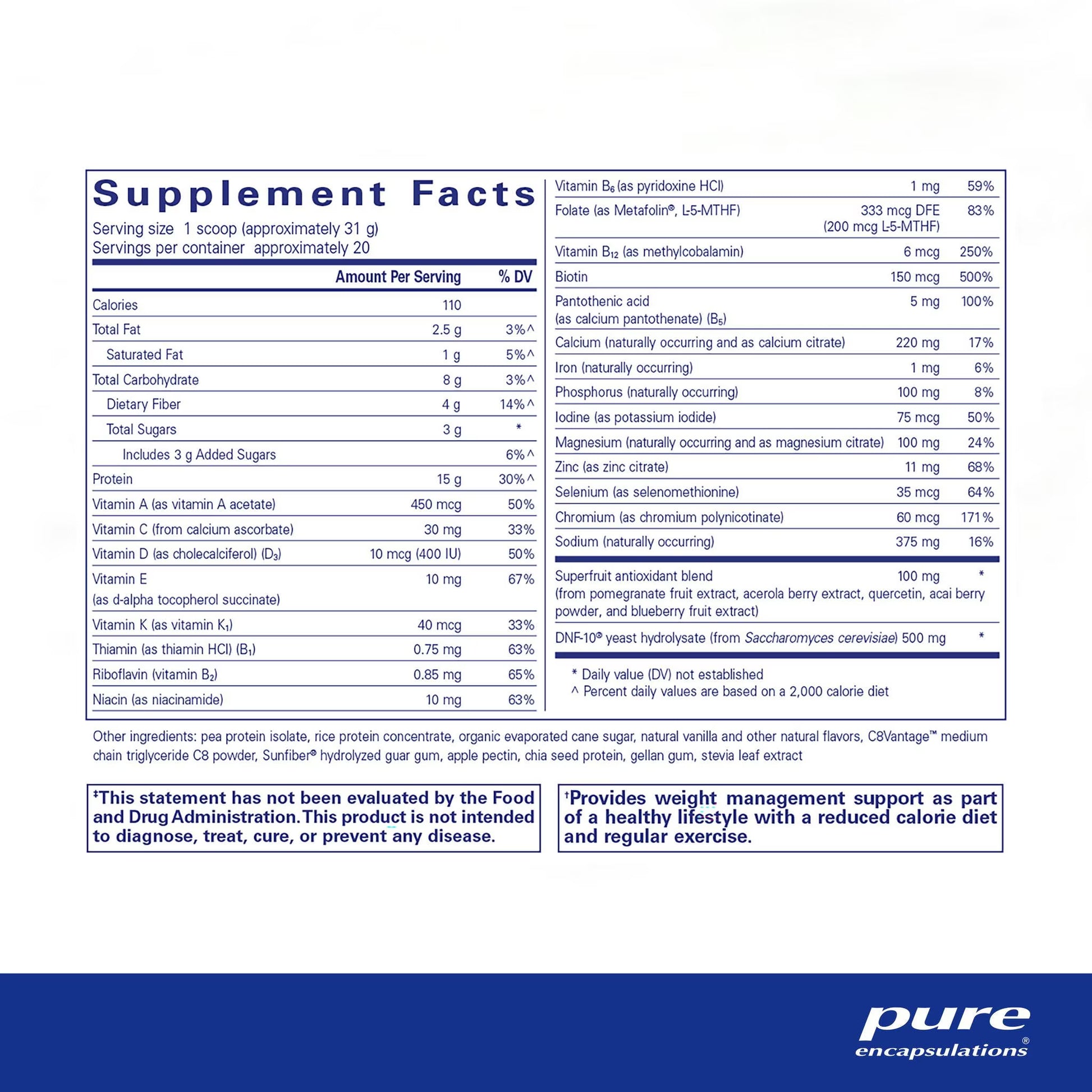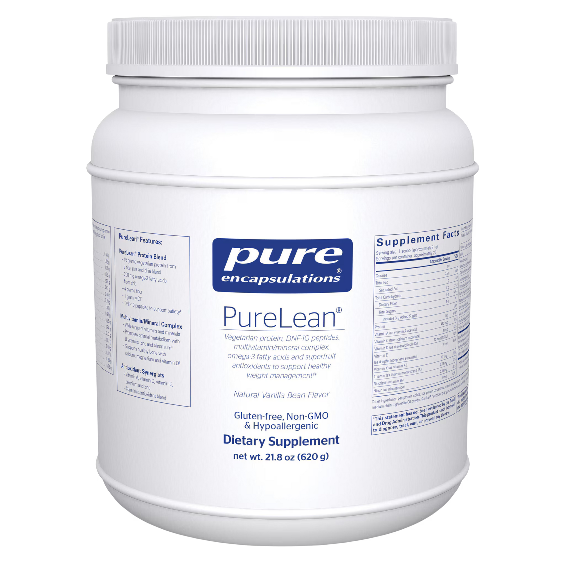 PureLean Protein offers a blend of vegetarian proteins, antioxidants, fiber and nutrients in a lightly sweetened formula. Diets higher in protein and fiber have been associated with healthy weight management and body composition, believed to be due, at least in part, to enhanced satiety and nutrient metabolism. Fiber also helps support digestive health, nutrient absorption and healthy glycemic control. Research suggests that a multivitamin/mineral can help moderate appetite to support healthy weight management. Clinical studies indicate that DNF-10 lowers ghrelin secretion between meals and neuropeptide Y in the hypothalamus to promote satiety. In four double-blind, randomized, placebo-controlled studies involving healthy overweight subjects, DNF-10 promoted a significant decrease in caloric intake, weight circumference, abdominal fat and body weight. In the most recent study, after 2 months of taking 500 mg DNF-10, subjects had decreased their daily caloric intake by 600 calories and 80% of the subjects thought less about eating during the day.
