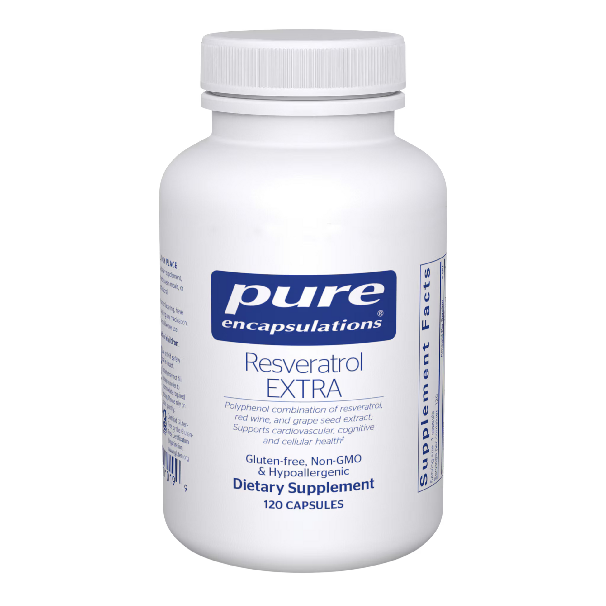 Resveratrol promotes cardiovascular health, helping to maintain healthy platelet function and arachidonic acid metabolism. A recent study suggests that it may also promote overall health, metabolic function and longevity. Grape seed extract and red wine concentrate offer polyphenols, complementing the cellular and cardiovascular health benefits of this complex. One capsule of Resveratrol EXTRA contains the amount of resveratrol equivalent to an average of 66 bottles of red wine.