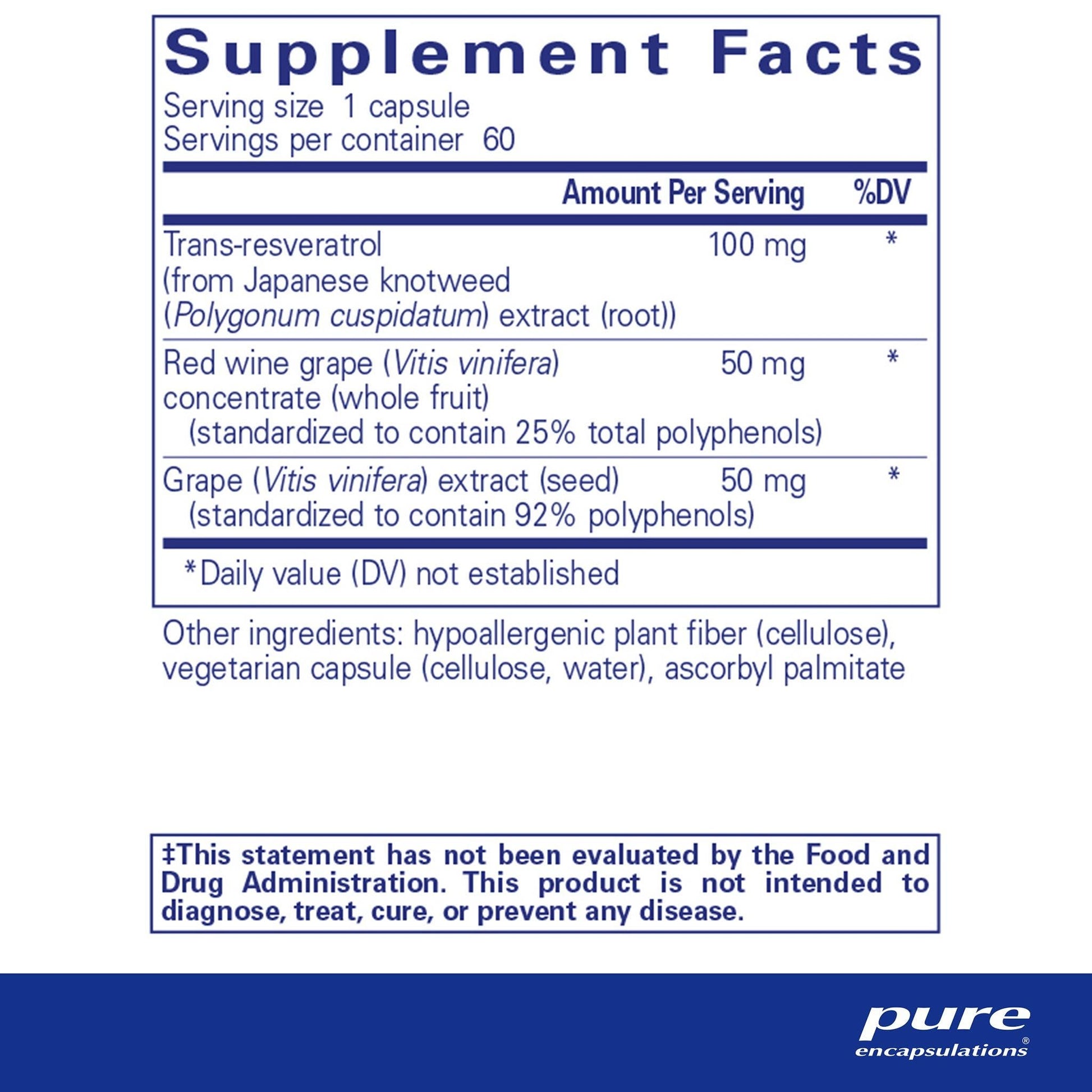 Benefits & Features Supports cellular and cardiovascular health Commonly known for its health benefits in red wine Promotes overall health, metabolic function and healthy aging Combines resveratrol with polyphenols from red wine and grape seed One capsule contains the amount...