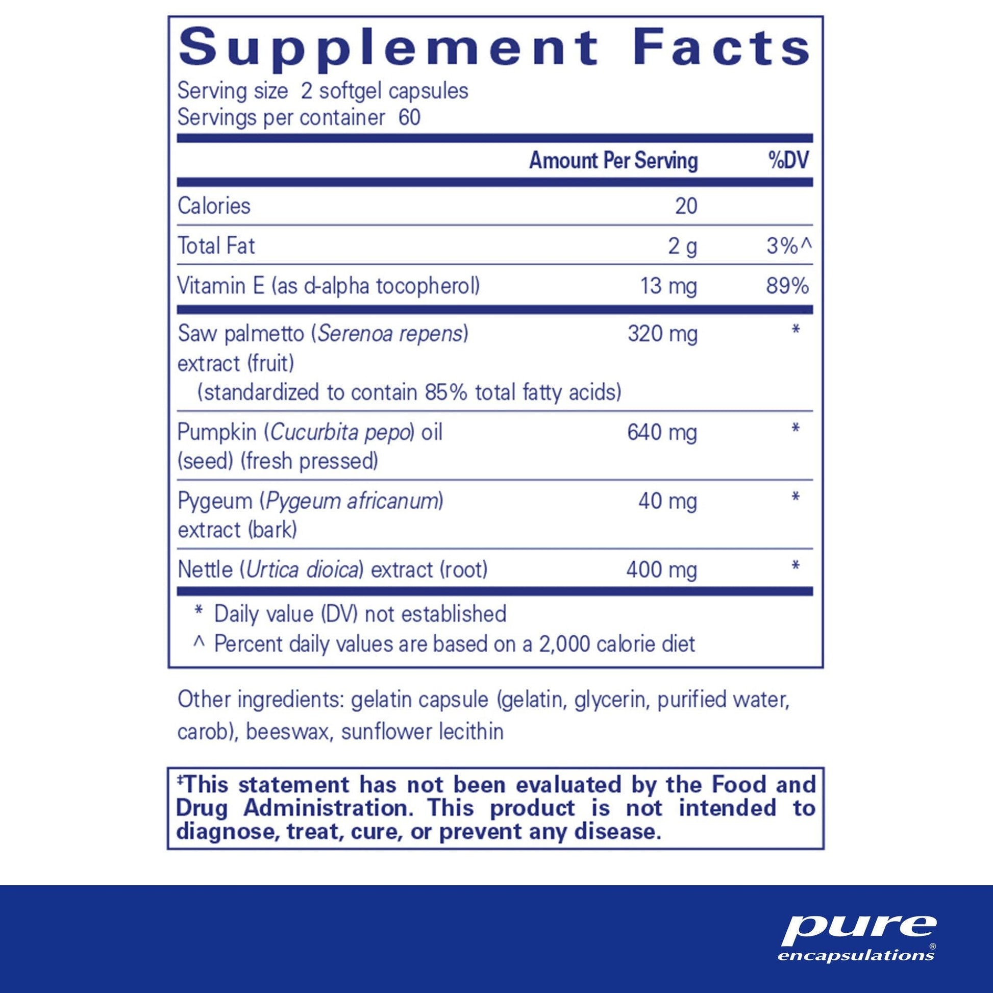 INDICATIONS: Ages 18 and up Prostate health and function support Healthy urinary flow SUGGESTED USE: As a dietary supplement, take 2 capsules, 1-2 times daily, between meals. WARNING:Not to be taken by pregnant or lactating women. If you have any health condition or are taking any medication, consult your health professional before use. SOURCE: Saw palmetto extract is produced using a supercritical CO2 extraction process. It is derived from Serenoa repens fruit and standardized to contain 85% total fatty acids. It typically contains 0.15% phytosterols. Pumpkin seed oil is derived from fresh pressed Cucurbita pepo. Pygeum africanum extract (bark) is standardized to contain 12% total sterols. It is wild-crafted and sustainably harvested to protect the tree. Pygeum harvesting is watched over by CITES. Nettle root is a 10:1 extract derived from Urtica dioica L. It typically contains 0.8% beta-sitosterol and 5% amino acids. STORAGE:Store in a cool, dry place.
