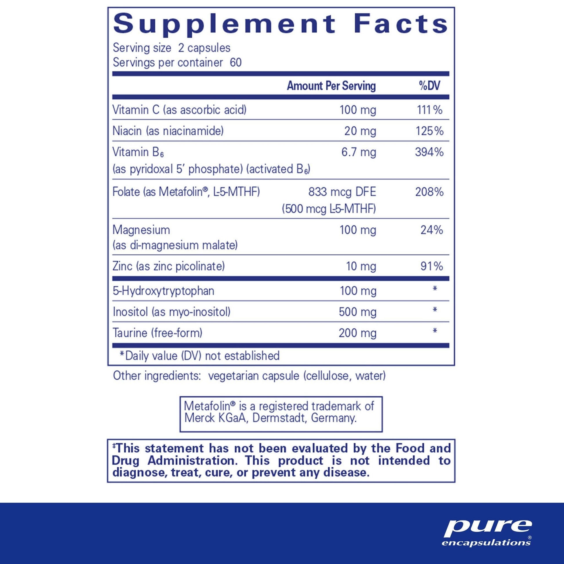 INDICATIONS: Ages 18 and up Positive mood and relaxation support Healthy eating behavior support SUGGESTED USE: As a dietary supplement, take 2 capsules, 1-2 times daily, between meals. WARNING:Not to be taken by pregnant or lactating women. If you have any health condition or are taking any medication, particularly psychiatric medications, consult your health professional before use. Do not use concurrently with antidepressants. SOURCE: Ascorbic acid is derived from corn dextrose fermentation Niacinamide, pyridoxal 5’ phosphate, folate (Metafolin, L-5-MTHF) and taurine are synthetic Magnesium and zinc are derived from the lime of rock 5-Hydroxytryptophan is derived from Griffonia simplicifolia seeds Myo-inositol is derived from rice bran STORAGE:Store in a cool, dry place.