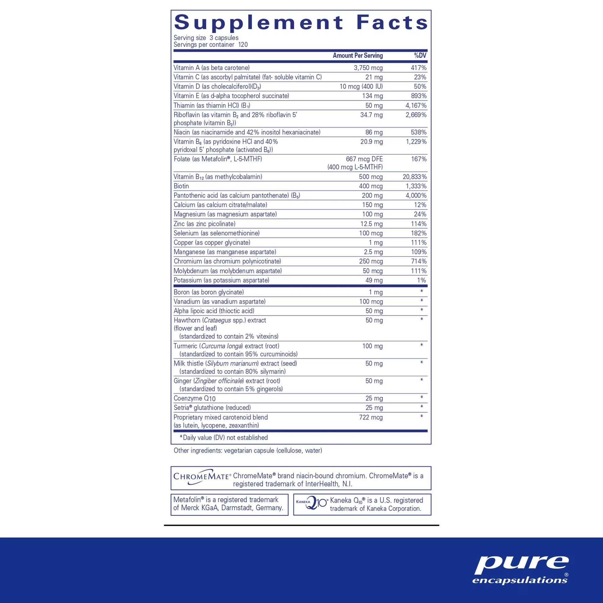 INDICATIONS: Ages 18 and up Enhanced support for cardiovascular and liver health SUGGESTED USE: As a dietary supplement, take 3 capsules, 1-2 times daily, with meals. WARNING: If you are pregnant or lactating, have any health condition or are taking any medication, consult your health professional before use. SOURCE: Beta carotene: Blakeslea trispora Lycopene: natural tomato concentrate Lutein: marigold flower extract Zeaxanthin: synthetic Vitamin C: corn dextrose fermentation Vitamin E: soybean Vitamin D3: cholesterol from wool fat (lanolin) Vitamin B1 (thiamine HCl): synthetic Vitamin B2 (riboflavin): corn dextrose fermentation Niacinamide and Inositol hexaniacinate: synthetic Vitamin B5 (calcium pantothenate): synthetic Vitamin B6 (pyridoxal HCl): synthetic Vitamin B12 (methylcobalamin): corn dextrose fermentation Folate (Metafolin, L-5-MTHF): synthetic Biotin: synthetic Minerals: naturally derived from limestone Reduced glutathione: derived naturally by glucose fermentation CoQ10 obtained naturally by fermentation Alpha lipoic acid: synthetic Sources of the mineral chelates include: Aspartate: synthetic Citrate: corn dextrose fermentation Citrate/Malate: synthetic Glycinate: synthetic Picolinate: synthetic Mixed carotenoid profile typically contains 15,000 mcg beta carotene, 425 mcg lycopene, 850 mcg lutein and 170 mcg zeaxanthin Hawthorn extract is derived from Crataegus oxyacantha and standardized to contain 2% vitexins Ginger extract is derived from Zingiber officinale root and standardized to contain 5% gingerols Milk thistle extract is derived from Silybum marianum and standardized to contain 80% silymarin Turmeric extract is derived from Curcuma longa and standardized to contain 95% curcuminoids STORAGE:Store in a cool, dry place.