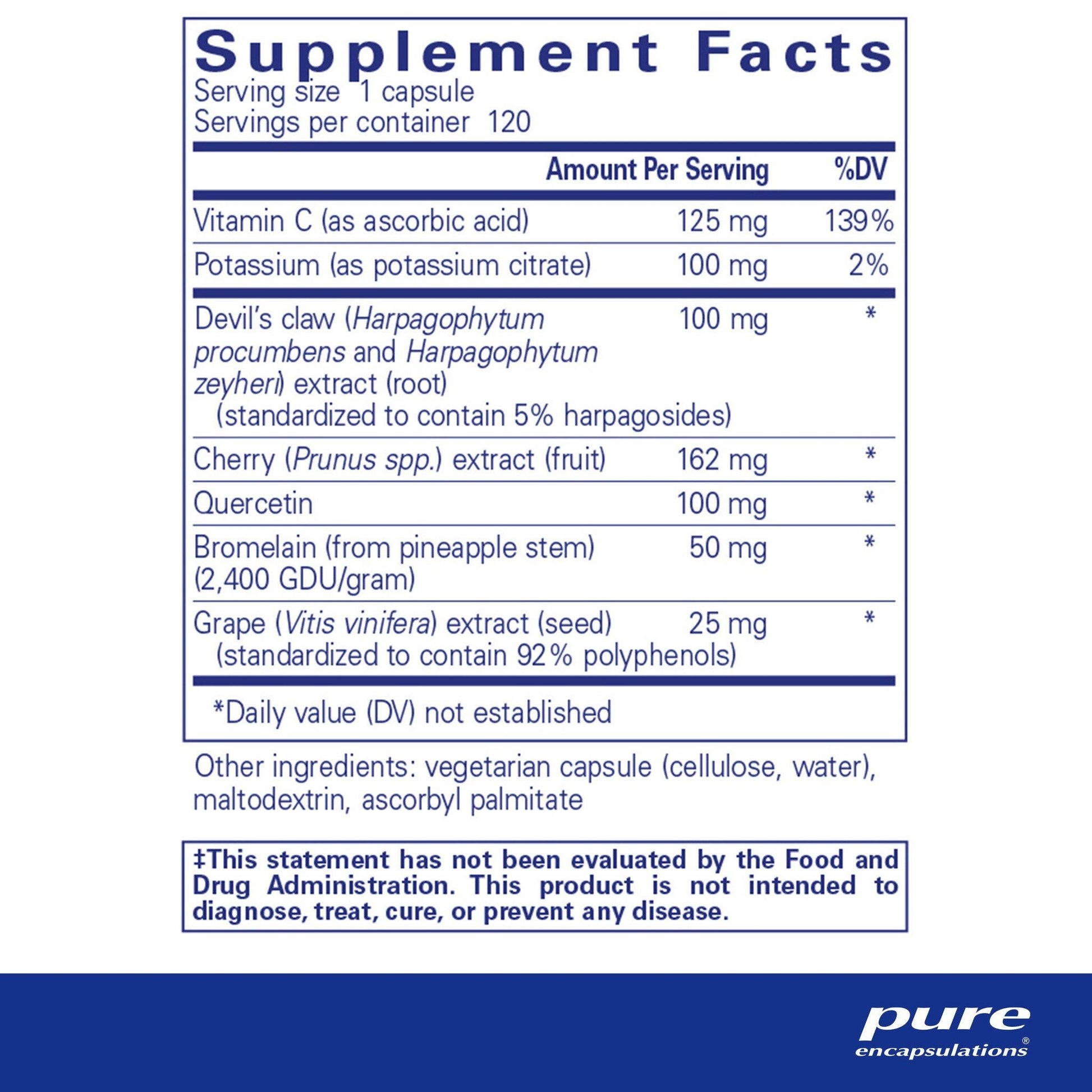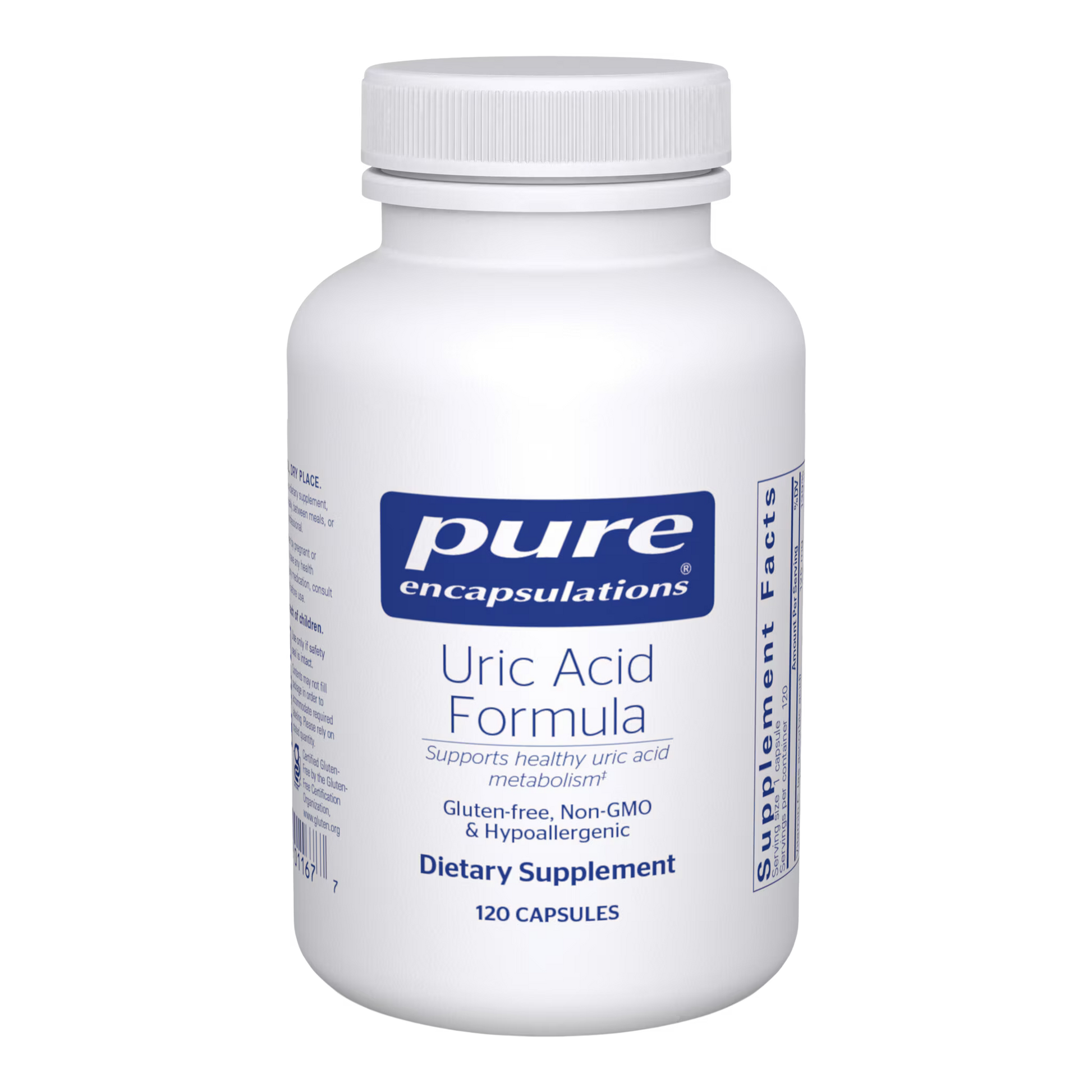 Uric Acid Formula provides vitamins and herbal extracts to support healthy uric acid metabolism by promoting healthy liver enzyme activity, immune activity and alkalization. In a population-based study involving almost 1,400 men from the Health Professionals Follow-up Study, vitamin C intake was associated with healthy serum uric acid metabolism. In another double-blind, placebo-controlled trial, vitamin C supplementation supported healthy glomerular filtration and maintained healthy serum uric acid excretion. The bioflavonoid quercetin has been associated with similar effects by maintaining proper xanthine oxidase and xanthine dehydrogenase activity, key liver enzymes involved in uric acid production. Potassium citrate is ncluded to support systemic alkalization. Urinary alkalization promotes healthy uric acid metabolism. Devil's claw and the proteolytic enzyme bromelain support immune mediator activity. Cherries have been used traditionally for decades to enhance healthy uric acid metabolism. Research indicates that regular cherry consumption maintains healthy plasma urate. Additionally, anthocyanins in cherries and grape seed act as free radical scavengers. This product is not intended to replace any dietary protocols recommended by a health professional.