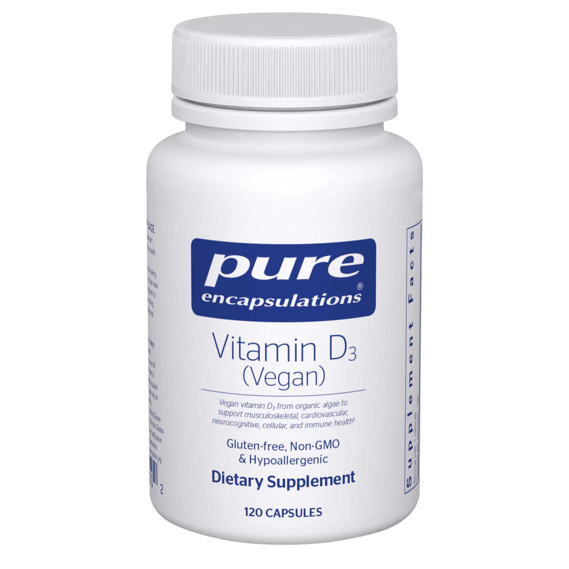 Pure Encapsulations vitamin D3 (vegan) is derived from organic algae. It is produced through a multistep process involving extraction, purification and concentration resulting in a vitamin D3 cholecalciferol with the same molecular structure and conformation as lanolin and fish oil-derived cholecalciferol. Research indicates that optimal vitamin D serum levels offer support for bone, breast, prostate, cardiovascular, colon and immune health.