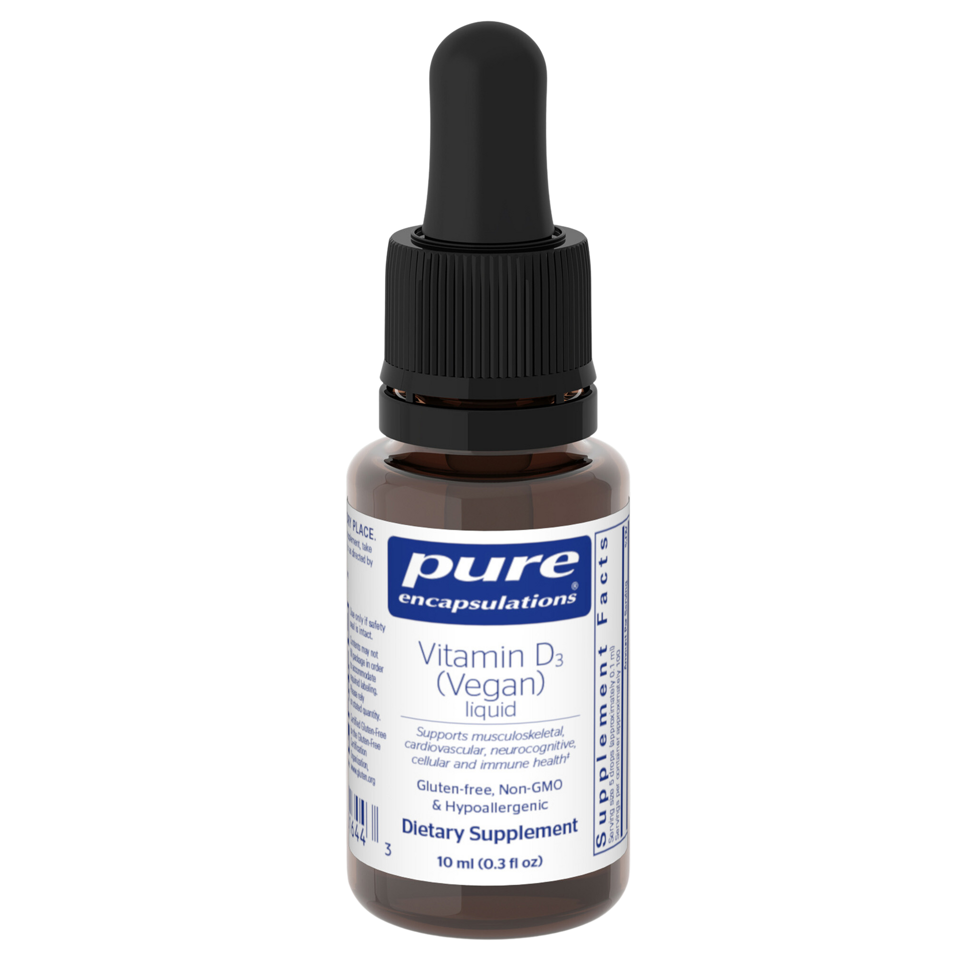 Pure Encapsulations' Vitamin D3 (Vegan) liquid is derived from naturally occurring, sustainably harvested lichen. It is produced through a multistep process involving extraction, purification and concentration resulting in a vitamin D3 cholecalciferol with the same molecular structure and conformation as cholecalciferol derived from lanolin or fish. It is the only plant-derived source of vitamin D3 that has been accepted by the UK Vegan Society. Vitamin D promotes intestinal calcium and phosphorous absorption and reduces urinary calcium loss, essential mechanisms for maintaining proper calcium levels in the body and for healthy bone composition. Research indicates that it also promotes cellular health, including support for breast and prostate tissue, in part by helping to maintain healthy blood vessel function, supporting immune cell activity and maintaining healthy cell metabolism. A role for vitamin D in supporting colon health by promoting healthy cellular function has also been suggested. Vitamin D's role in immune health has long been established; vitamin D receptors are found in a number of immune cells, including lymphocytes and macrophages, where they maintain healthy immune cell activation. Vitamin D also supports cardiovascular function in some individuals.