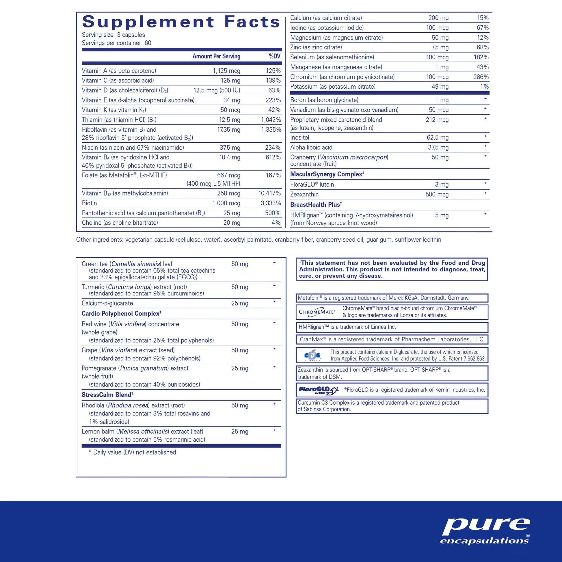 Women's Nutrients 40+ is specifically formulated to meet the nutritional needs of women over 40, providing a complete range of vitamins, minerals and trace elements. It includes 200 mg calcium (as citrate), the highest elemental dose of all our multivitamins, together with vitamin D3 and vitamin K1 for healthy bones. This formula provides antioxidant support with naturally derived vitamin C, vitamin E, beta carotene, lycopene, lutein, zeaxanthin and alpha lipoic acid. It also promotes healthy hair, skin and nails with 1,000 mcg biotin and supports breast cell health with HMRlignan, calcium-D-glucarate, green tea and Curcumin C3 Complex . HMRlignan provides support for hot flashes. Polyphenols from pomegranate, red wine concentrate and grape seed extract maintain healthy blood vessel function. Lutein and zeaxanthin, together with vitamin C, vitamin E and zinc, enhance the integrity of the macula and retina. Cranberry and vitamin C maintain healthy urinary tract ecology. This formula also helps moderate occasional stress with the adaptogenic properties of Rhodiola rosea and the calming properties of lemon balm.