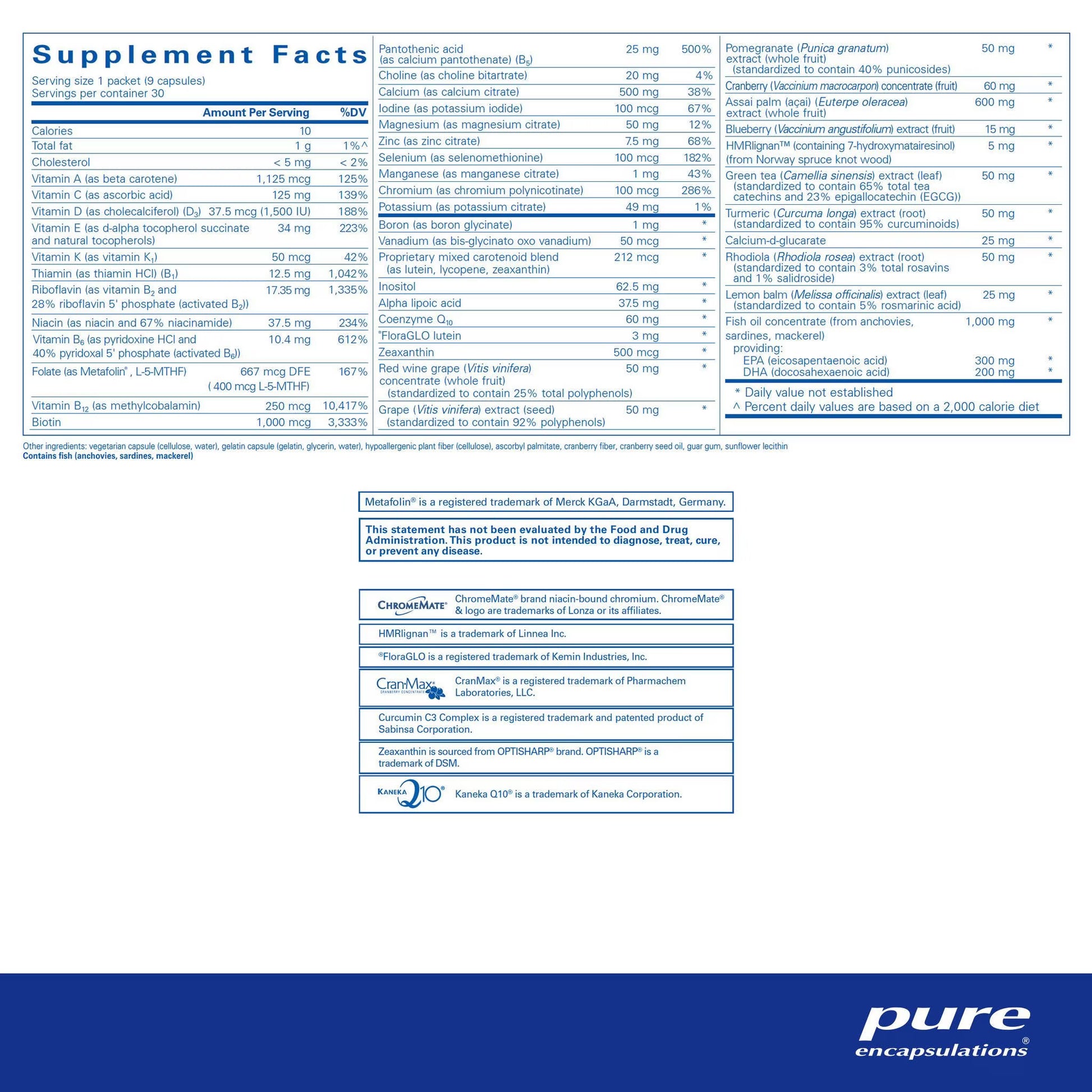 Women's Pure Pack is designed to promote emotional health, as well bone, cardiovascular, macular, and breast cell health with a comprehensive profile of bioavailable vitamins, chelated minerals, fish oil and other ingredients. Vitamin and minerals act as cofactors to support energy production, while the herbal adaptogens rhodiola and lemon balm help moderate occasional stress. Each packet contains 500 mg calcium and 37.5 mcg (1,500 IU) vitamin D3 to support healthy bone. Omega-3 fatty acids, CoQ10, and polyphenols from acai, cranberry, pomegranate, red wine concentrate and grape seed extract promote healthy cardiovascular function. HMRlignan calcium-d-glucarate, green tea and curcumin help support breast cell health. Lutein, zeaxanthin and nutrient cofactors enhance the integrity of the macula and retina.